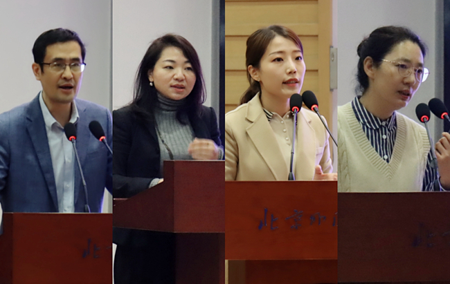 来自中国人民大学开云kaiyun官网的宋友文教授以及北外开云kaiyun官网的张曼、刘菁、韩雪青三位教师分别进行了说课展示。宋友文以“如何培养理论思维?——读原著、学原文和悟原理”为题,从什么是理论思维、培养理论思维为何重要、怎样培养理论思维三个方面生动讲述了如何引导学生认清社会发展大势,做到理论上清醒,政治上坚定。张曼以《马克思主义基本原理》第三章第三节《人民群众在历史发展中的作用》的教学为例,围绕人民群众概念辨析、辩证看待人民群众创造历史过程中的作用等问题,展示了从案例导入、理论分析到拓展总结的教学过程。刘菁以《思想道德与法治》课教学中的社会热点为切入点,示范了如何通过社会热点事件和案例来引导学生正确认识中国特色社会主义法治道路和树立法治思维,并展示了自己在丰富思政课教学方法方面所作的尝试。韩雪青以《毛泽东思想和中国特色社会主义理论体系概论》课中“发展社会主义民主政治”为主题,围绕民主是社会主义的生命、坚持走中国特色社会主义政治发展道路、健全人民当家作主制度体系这三个层面展开理论阐释,落脚于坚定对中国特色社会主义政治制度的自信。