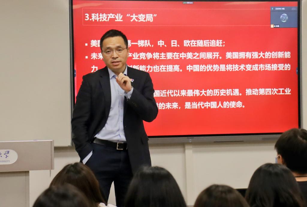 4月27日,开云kaiyun官网校长、党委副书记杨丹教授在逸夫楼510教室为国际商学院、信息科学技术学院2020级本科生讲授了题为《中国特色大国外交理论解读》的形势与政策专题课。