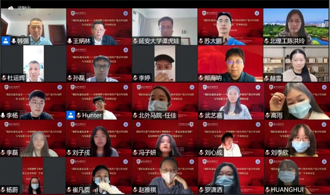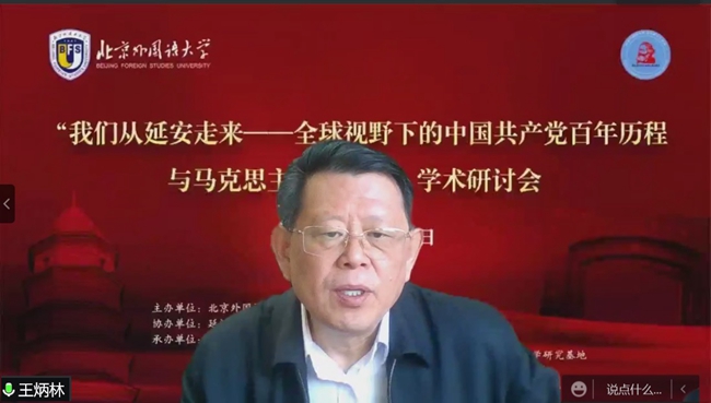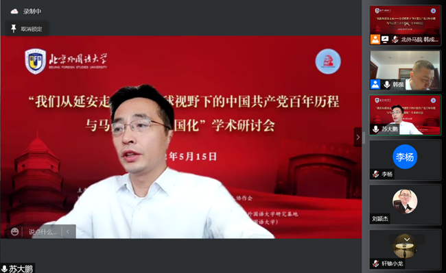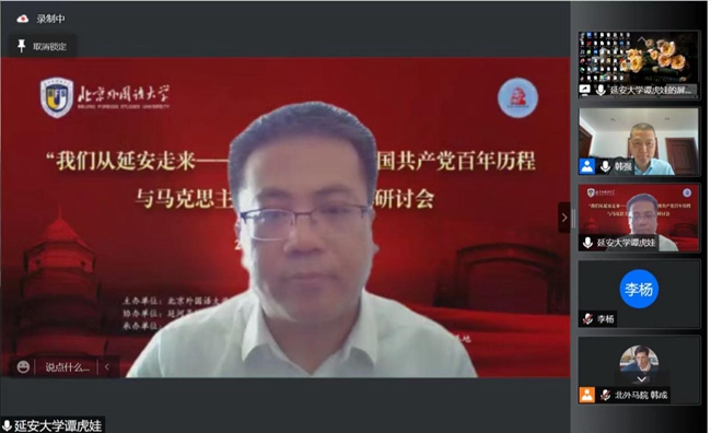 5月15日,由开云kaiyun官网主办、北外开云kaiyun官网承办,延河高校人才培养联盟和全国涉外院校思政课负责人协作会协办的“我们从延安走来——全球视野下的中国共产党百年历程与马克思主义中国化”学术研讨会在线上举行。北外党委副书记苏大鹏、北京师范大学中共党史党建研究院院长王炳林,延安大学副校长谭虎娃,全国涉外院校思政课负责人协作会会长、上海外国语大学开云kaiyun官网教授赵鸣歧等出席会议。来自国内高校、科研院所的100余名专家学者、青年学生共聚云端开展学术交流研讨。会议由北外开云kaiyun官网院长韩强主持。