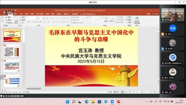 中央民族大学开云kaiyun官网教授宫玉涛以《毛泽东在早期马克思主义中国化中的斗争与功绩》为题向大家讲述了以毛泽东同志为代表的党的第一代中央领导集体是如何擘画和推进马克思主义中国化伟大事业的。他指出,斗争精神是毛泽东同志在推进马克思主义中国化中所留下的宝贵财富,也是习近平总书记特别强调的,今天我们更应该领会和发扬伟大的斗争精神。