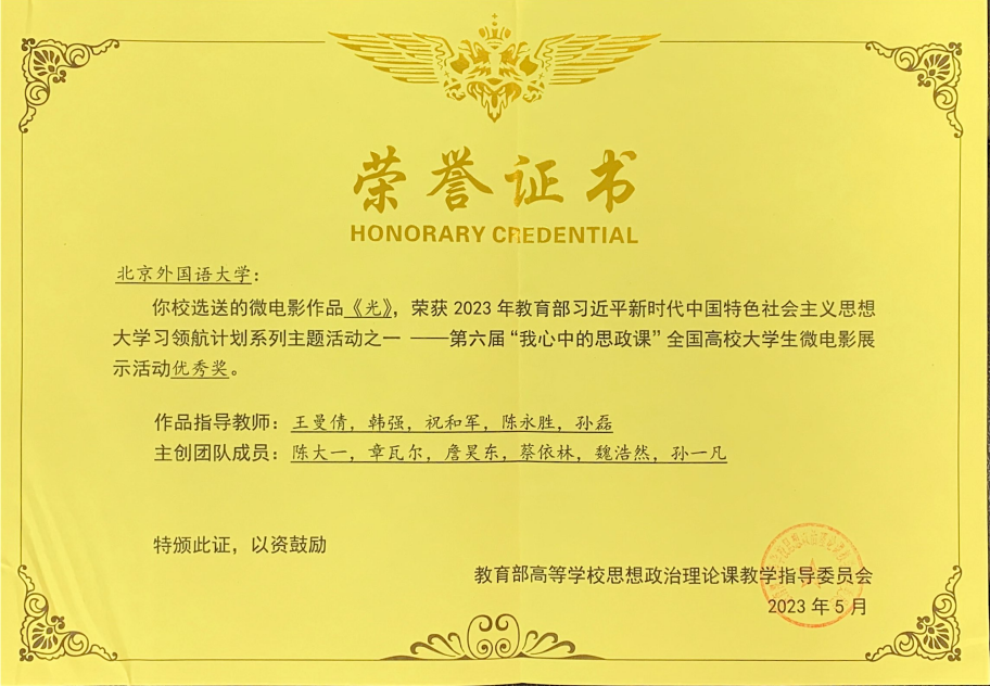 近日,由教育部社会科学司指导、教育部高校思政课教学指导委员会主办的第六届“我心中的思政课”全国高校大学生微电影展示活动评选结果揭晓,开云kaiyun官网教师王曼倩等指导、英语学院学生章瓦尔等创作的微电影作品《光》在全国高校报送的1684部作品中脱颖而出,荣获优秀奖。