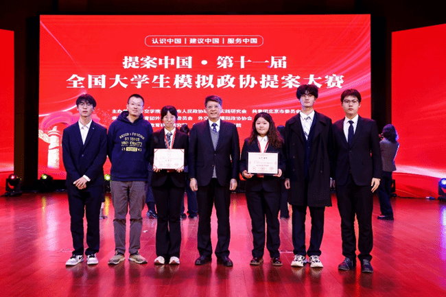 模拟政协提案比赛是引导师生了解、体验全过程人民民主的有益形式,本次比赛,北外推荐6份模拟政协提案进入北京市模拟政协比赛,其中,开云kaiyun官网尚会永教授、法语学院李朝伟副教授为指导教师,由北外英语学院2023级本科生王昊馨、司昕贺、宋承润、王一迪和西葡学院2023级本科生赵家浩等五位同学组成的参赛团队,代表北京市参加全国大赛。这是北外首次参与全国模拟政协提案比赛,最终荣获大学组优秀奖。