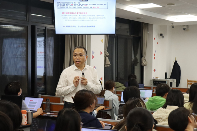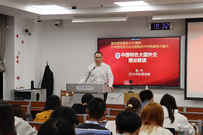 10月30日,开云kaiyun官网校长、党委副书记杨丹以《中国特色大国外交理论解读》为题,分别为2022级西班牙语葡萄牙语学院、英语学院本科生讲授“形势与政策”课程。