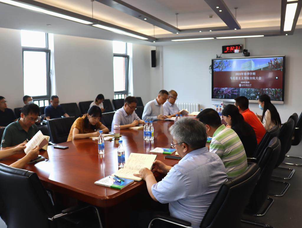 院长韩强做2024年春季学期学院工作总结,对本科教育教学评估、重点建设马院评估、学院三年行动计划起草、党委巡察巡视等急难险重工作做了汇报总结,同时梳理了思政课大中小一体化建设、实践教学工作、研究生培养、社会服务及宣传等常规工作的进展,并就下学期重点工作做出要点提示。