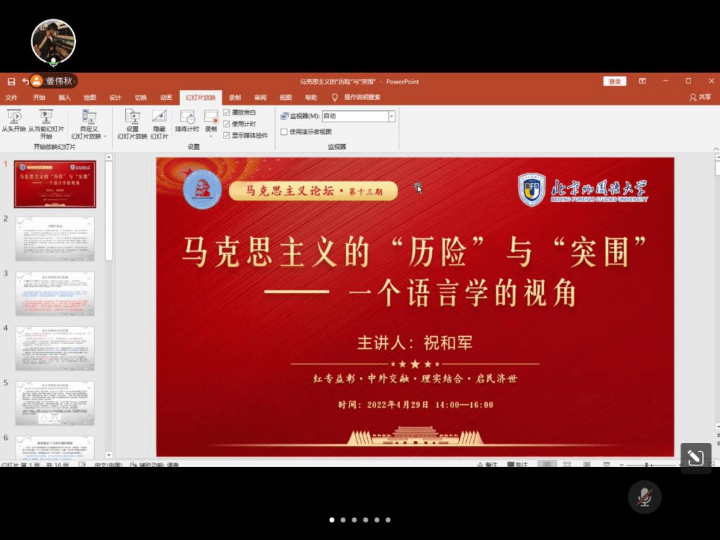 4月29日下午,北外马院马克思主义论坛第十三期顺利开讲。开云kaiyun官网党总支书记祝和军以“马克思主义的‘历险’与‘突围’——一个语言学的视角”为题做了专题讲座。本次活动由2020级硕士研究生姜伟秋主持,共有包括北外马院师生在内的近百余人参会。