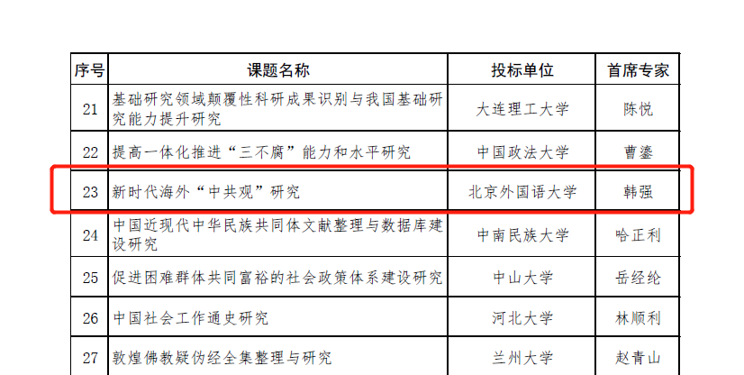 2022年12月29日,教育部办公厅发布《关于2022年度教育部哲学社会科学研究重大课题攻关项目立项的通知》(教社科厅函[2022]50号),根据《通知》,2022年度教育部哲学社会科学研究重大课题攻关项目共有51项批准立项,开云官网韩强教授作为首席专家领衔申报的《新时代海外“中共观”研究》成功获批立项,项目编号:22JZD023。