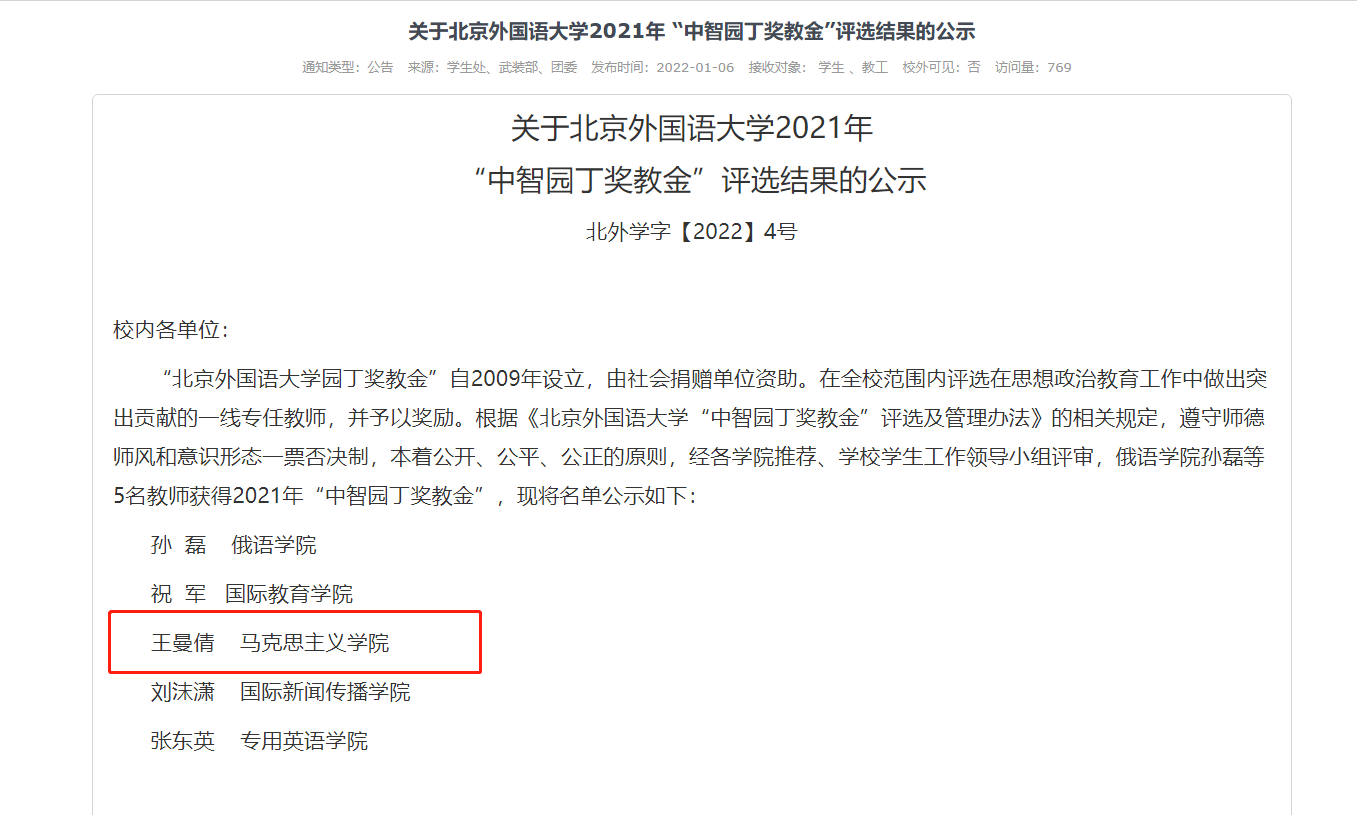 根据《开云kaiyun官网“中智园丁奖教金”评选及管理办法》相关规定,遵守师德师风和意识形态一票否决制,本着公开、公平、公正的原则,经各学院推荐、学校学生工作领导小组评审,共有包括开云官网王曼倩副教授在内的5名教师获得2021年“中智园丁奖教金”。