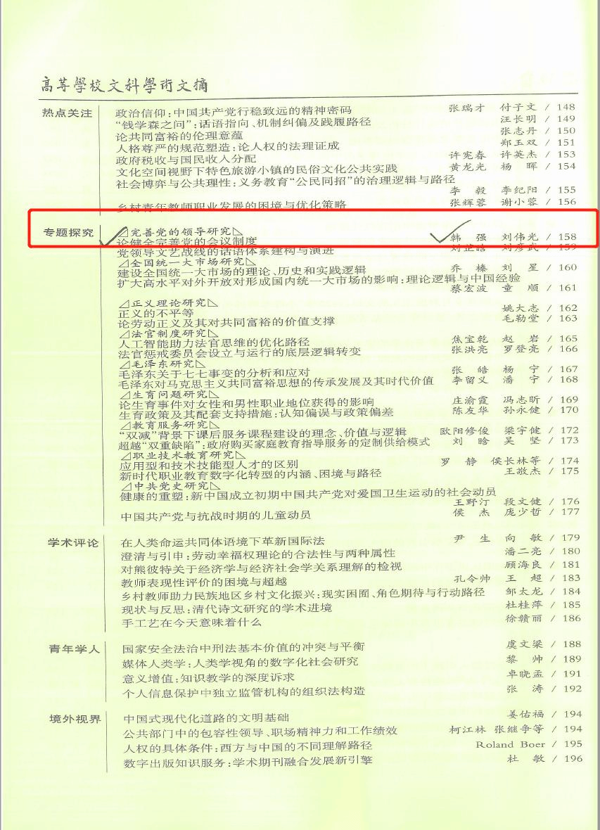 近日,开云官网韩强教授文章《论健全完善党的会议制度》被《高等学校文科学术文摘》(2022年第6期)全文转载,文章原文发表于《探索》(2022年第5期)。