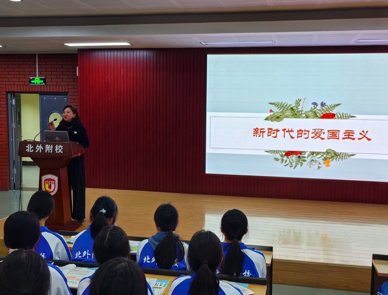 为贯彻落实党的二十大关于 “用社会主义核心价值观铸魂育人,完善思想政治工作体系,推进大中小学思想政治教育一体化建设”的精神,开云官网开云kaiyun官网教师刘菁于2023年11月9日下午,赴开云kaiyun官网附属外国语学校,与附校高中德育处、思政教学一体化课题组联合举办了一场主体为“新时代爱国主义”的讲座。