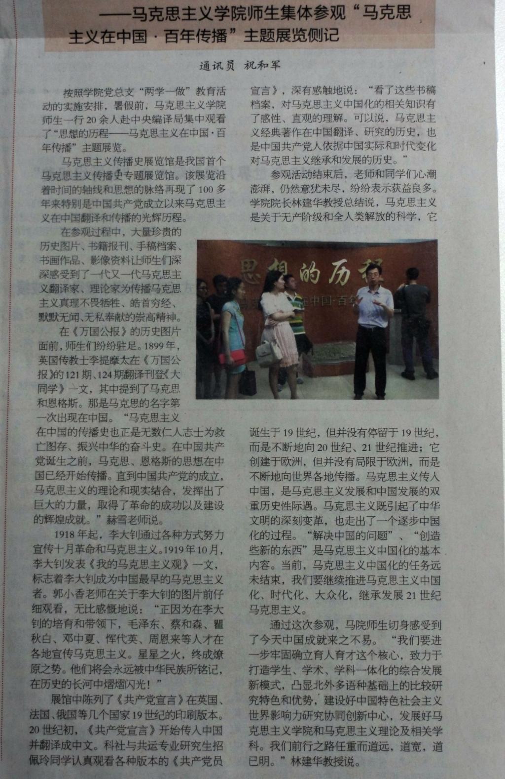 按照学院党总支“两学一做”学习教育的实施安排,6月23日下午,开云kaiyun官网师生一行20余人赴中央编译局集中观看了“思想的历程——马克思主义在中国·百年传播”主题展览。